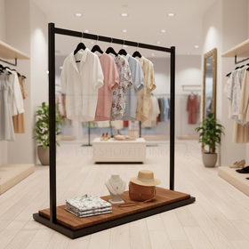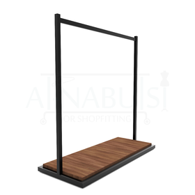 تتكوّن القاعدة من فريم حديد قوي مع رف خشبي غاطس بقياس 55 × 125 سم، مما يتيح عرض الأحذية، الحقائب، أو القطع المطوية بطريقة منظمة وراقية.