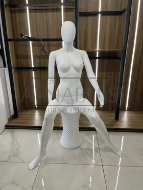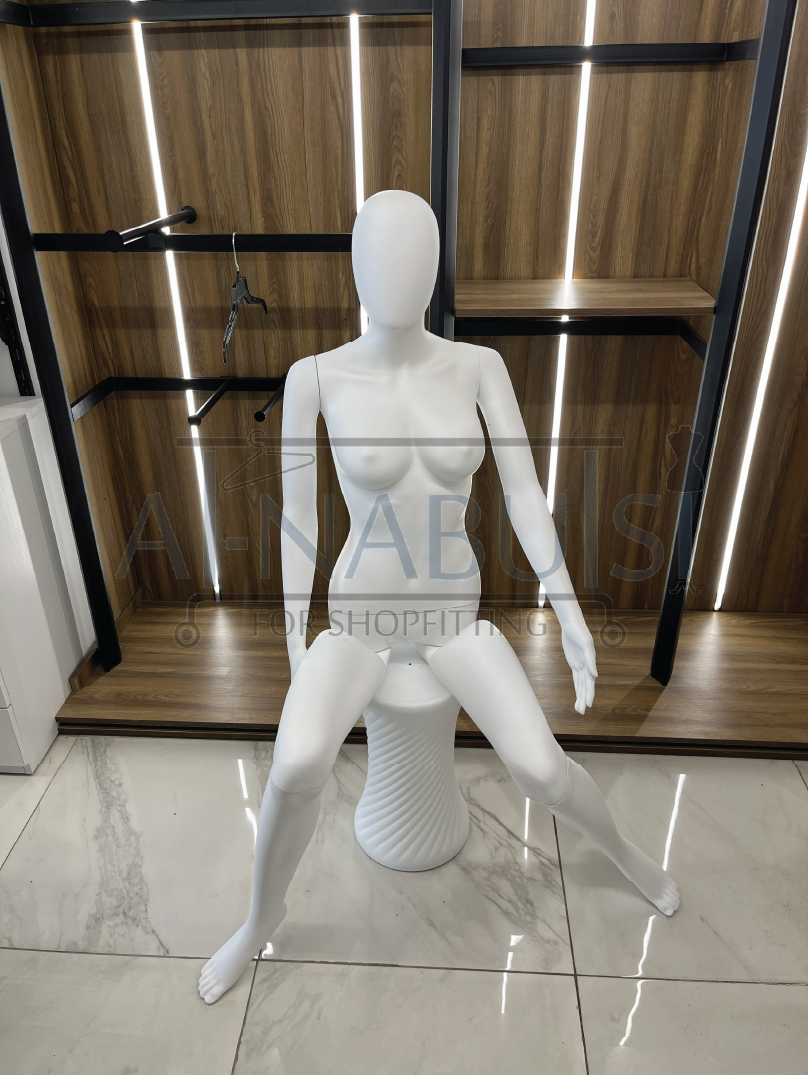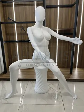 مانيكان جسم كامل نسائي بتصميم واقعي مميز بوضعية جلوس أنيقة، مثالي لعرض الأزياء بطريقة مريحة وجذابة داخل المحلات والمعارض.