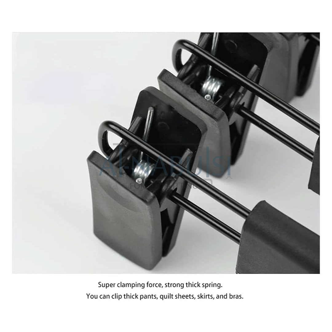 علاقة ملقط بلاستيك ربر قوية ومتانة عالية، مصممة لتحمل كافة أنواع الملابس دون تلف. تأتي هذه المجموعة بملقطين باللون الأسود متصلين بسلك حديدي قوي، بطول 32 سم، لتوفير تعليق آمن ومستقر للملابس. مناسبة لكل من الملابس الرجالية والنسائية، وتناسب الاستخدام في المنازل أو المحلات التجارية.