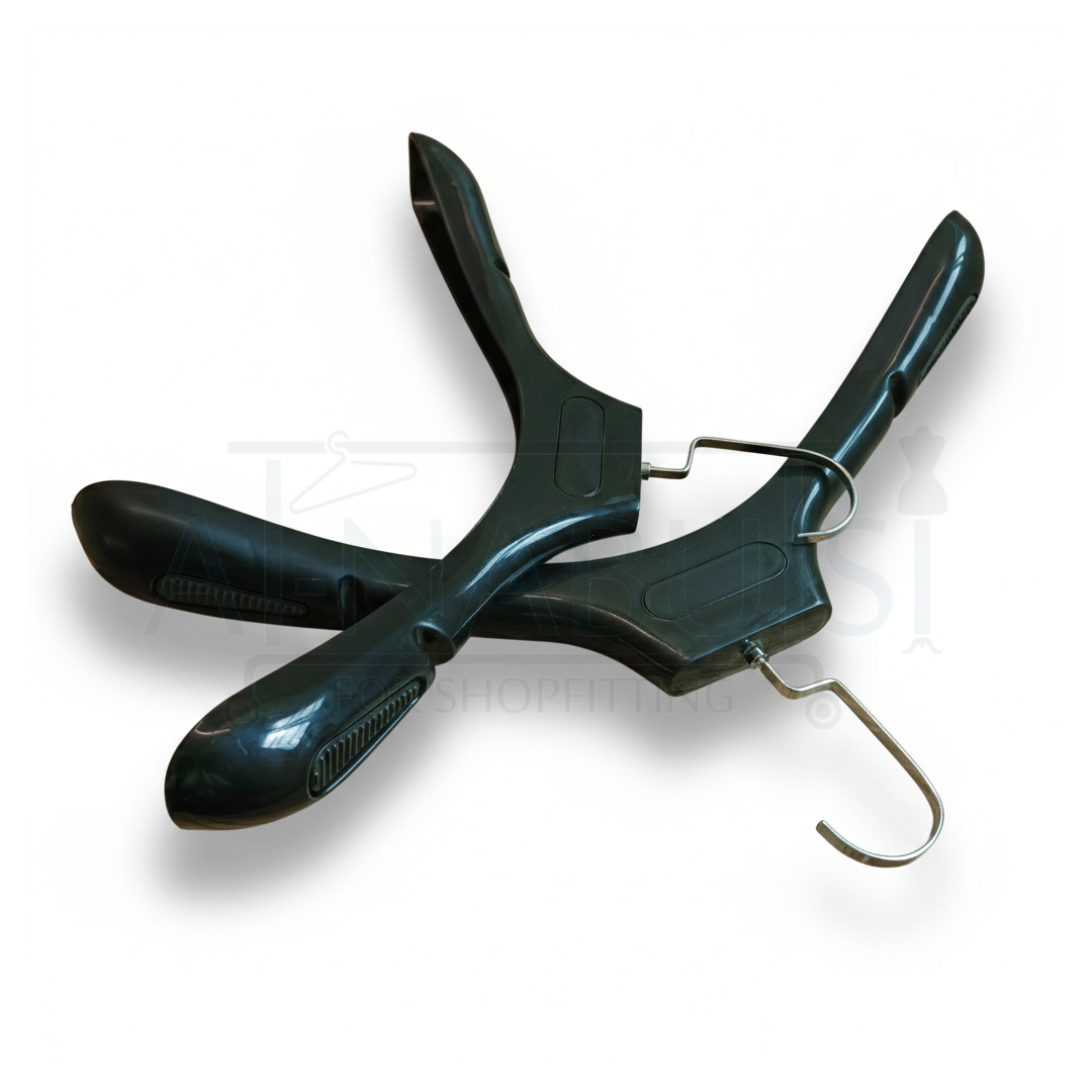 تحتوي العلاقة على أكتاف عريضة مع فتحات جانبية لتعليق القطع التي تحتوي على شيّال مثل الفساتين والبلوزات، مع خطاف مسطح متوفر باللون الأسود أو الفضي ليتناسب مع أنظمة التعليق المختلفة.