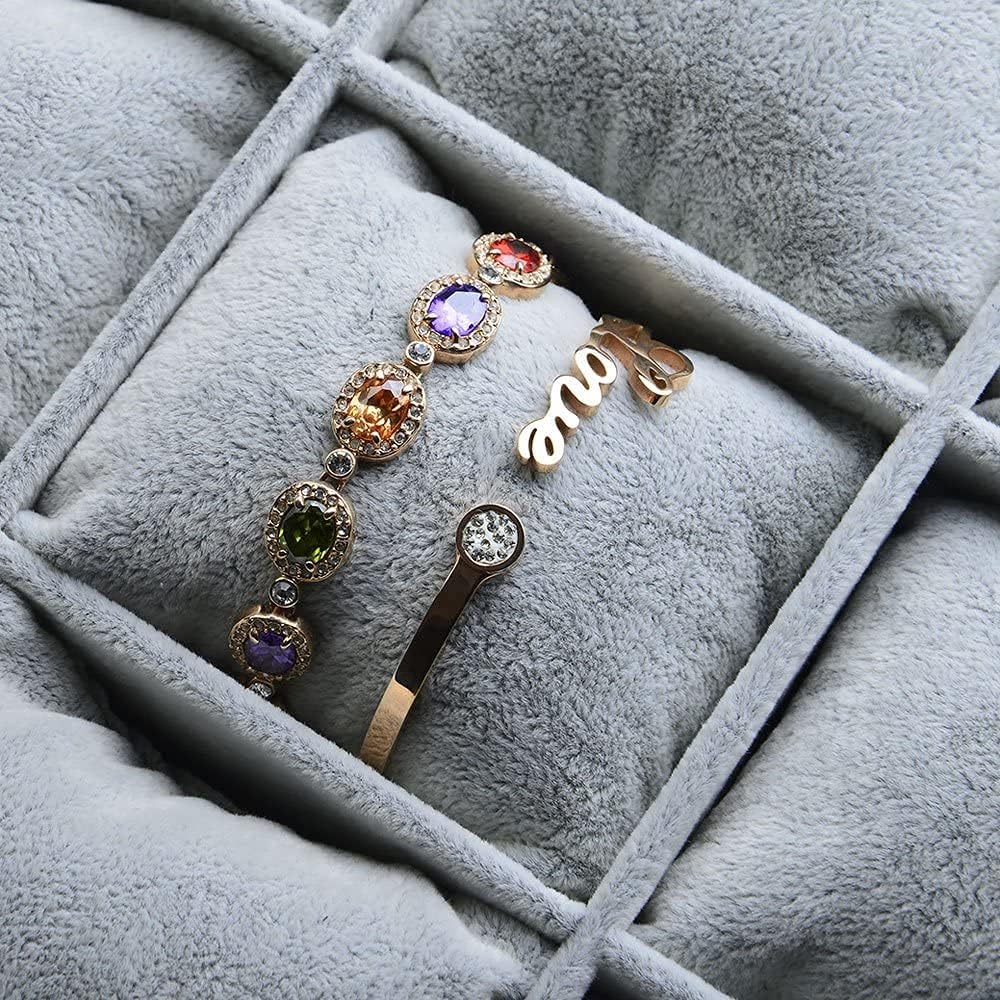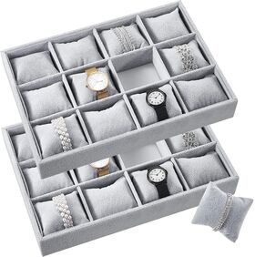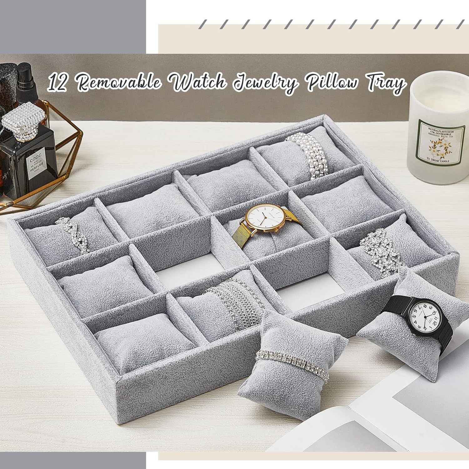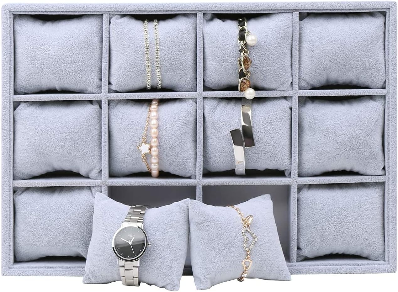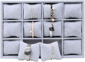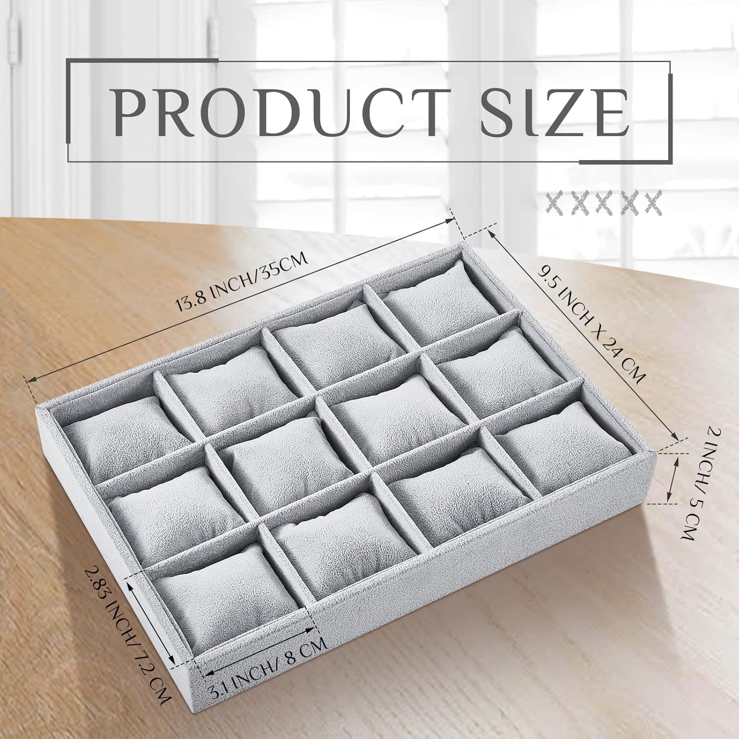 Luxury velvet display tray designed for elegantly showcasing watches and bracelets. The tray features 12 individual compartments, each equipped with a small cushion to protect your items from scratches and highlight their beauty. Perfect for stores, exhibitions, or personal collections, providing a neat and premium presentation for any display surface.