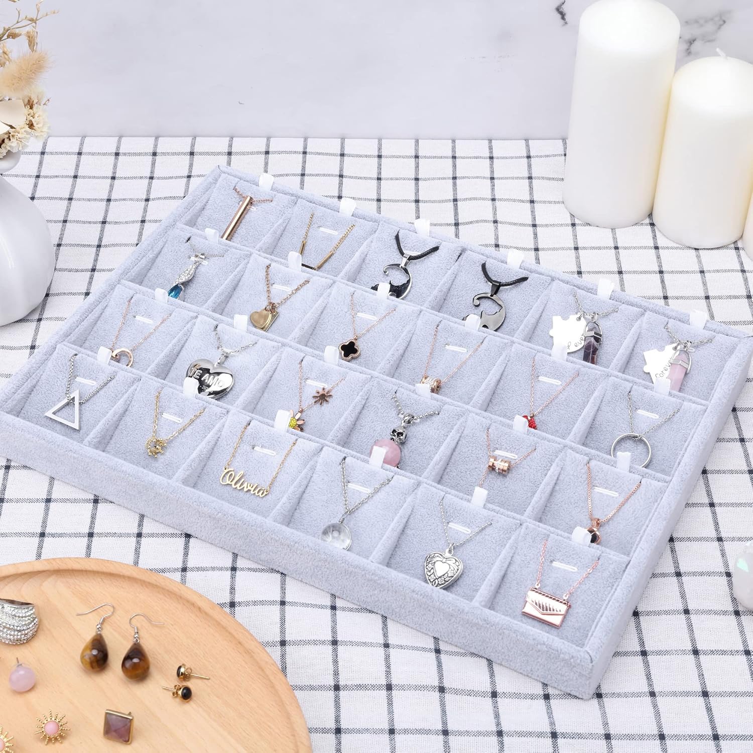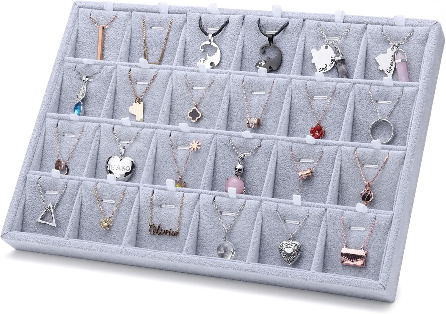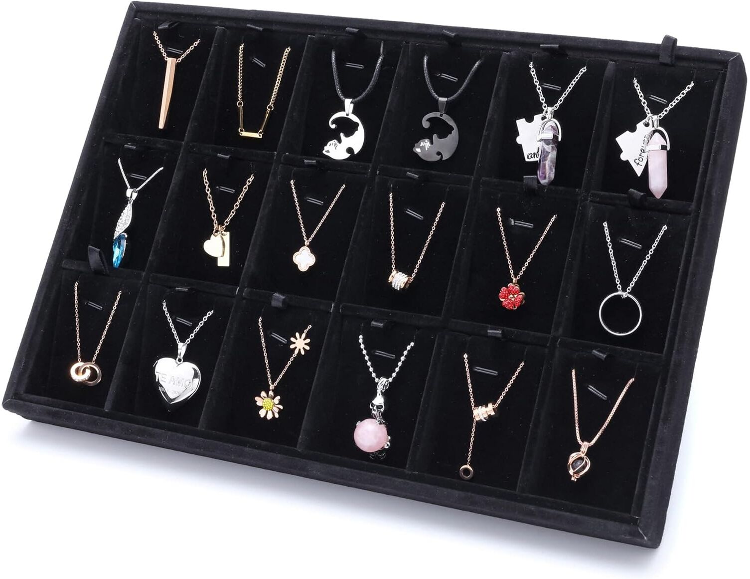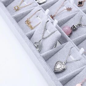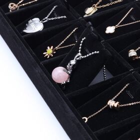 Luxury velvet-padded display tray designed for showcasing chains and rings in an elegant and organized way. Featuring 18 individual compartments, it allows you to display each piece neatly while providing extra protection from scratches. Perfect for stores, exhibitions, or personal jewelry collections, adding a premium touch to any display surface.