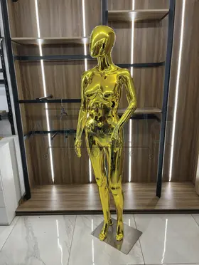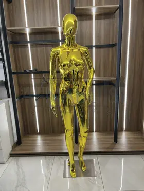 Elegant gold full-body female mannequin featuring a curved feminine pose that highlights the natural beauty and flow of clothing.