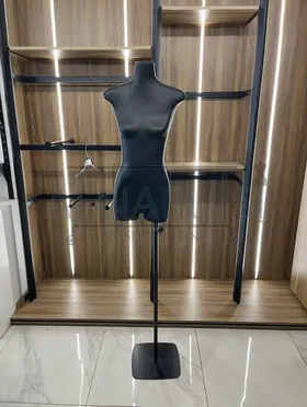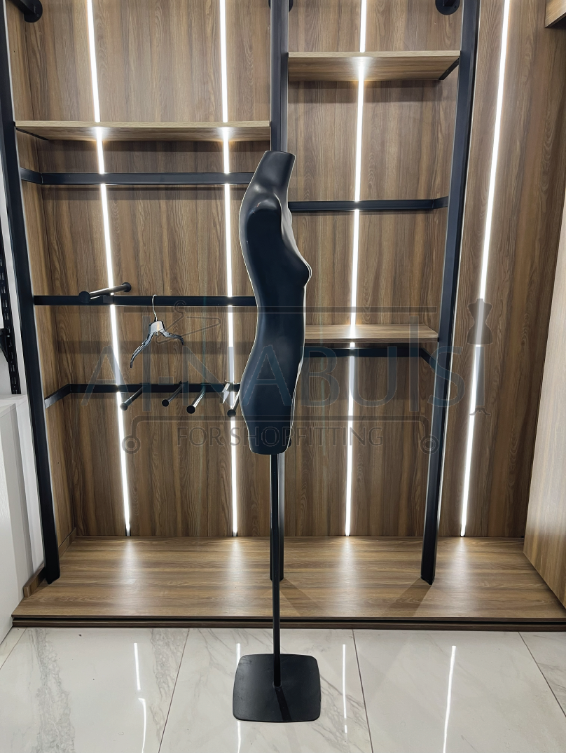 High-quality half female mannequin made of fiberglass with a polished black finish and elegant marble base. Specially designed for displaying dresses and sets professionally, highlighting design details clearly. The mannequin features a sturdy body for easy clothing display and provides a realistic presentation for small-sized dresses and sets.