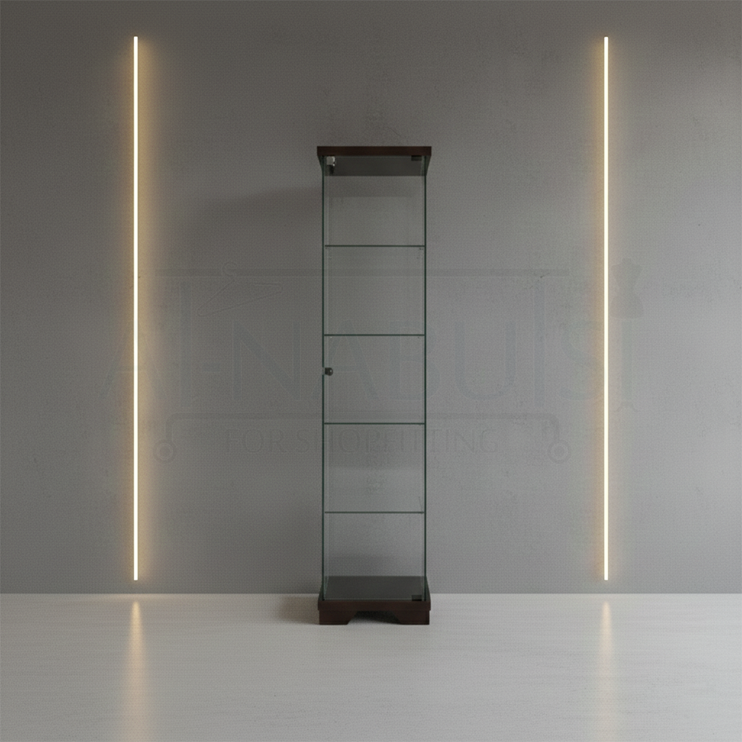 Tempered glass display showcase designed for elegant and secure product presentation in retail stores and exhibitions.