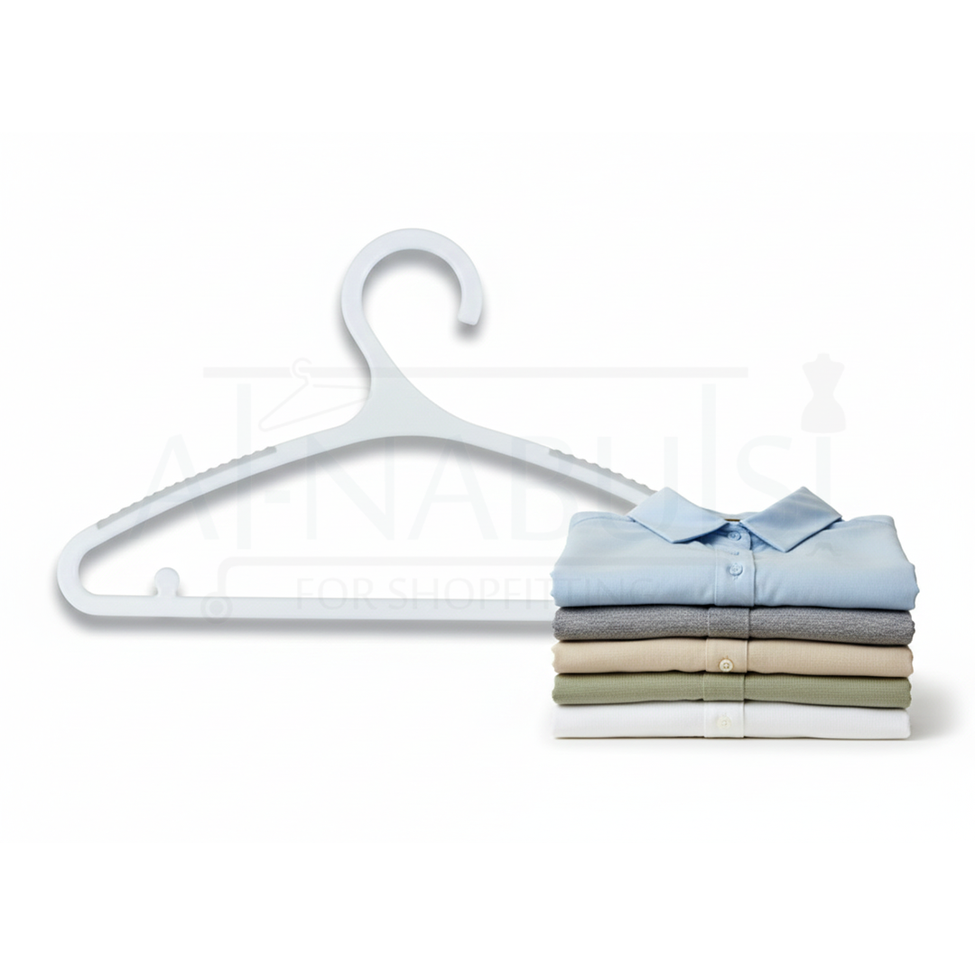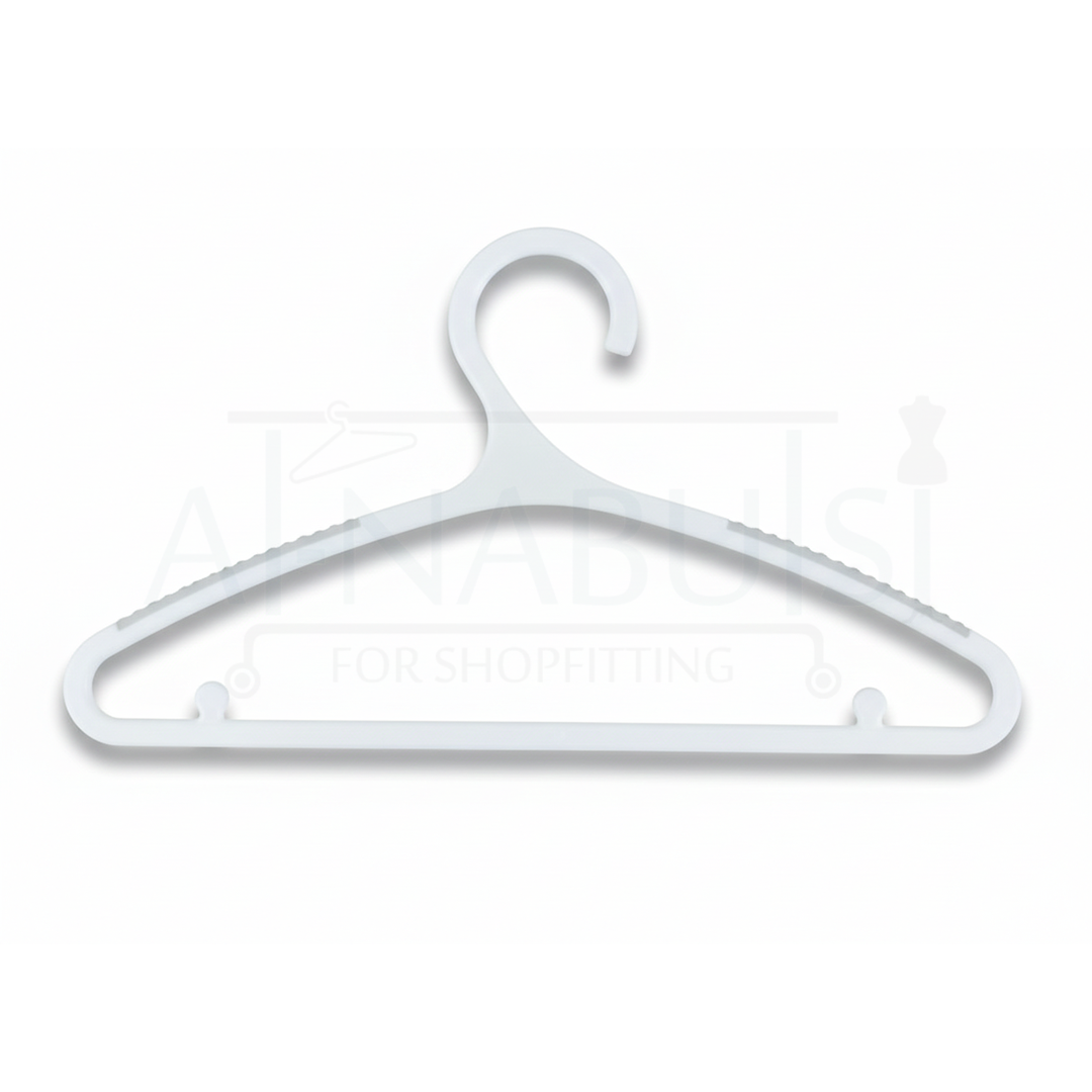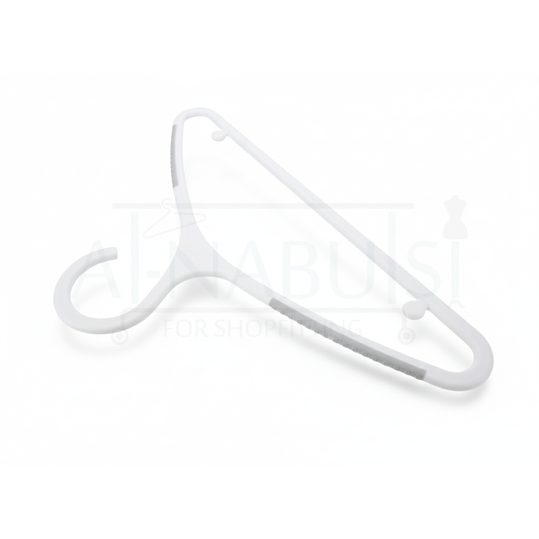 High-quality slim plastic clothes hanger from Al Nabulsi for Shopfitting, fully made of durable plastic with a clean white finish suitable for home use.