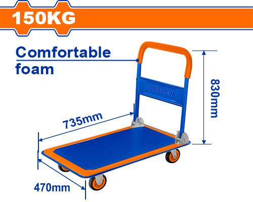 The WADFOW WWB1315 foldable platform hand truck supports up to 150 kg of load and features a sturdy steel frame. The handle is foam‑covered for comfortable grip during push or pull operations. Fully extended dimensions are 735 × 470 × 830 mm, while folded dimensions are 735 × 470 × 220 mm, making it compact for storage. The platform size is 735 × 470 mm, and it rolls on 100 mm diameter PP+TPR wheels. Net weight approx. 7 kg. Model code: WWB1315.